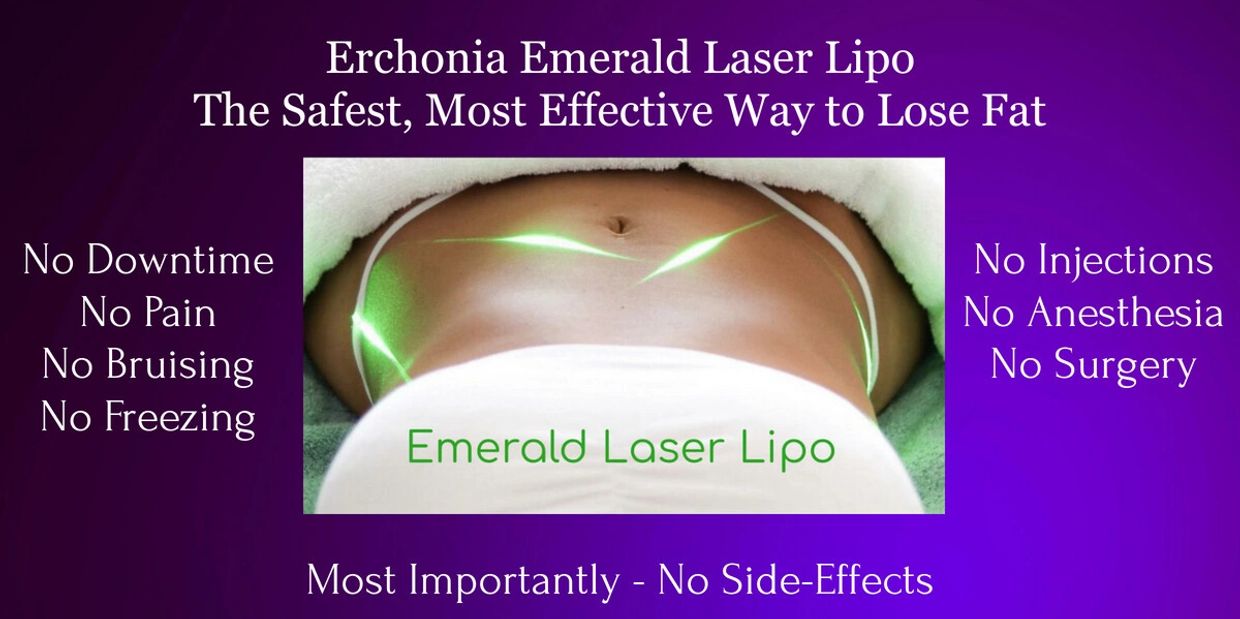 Not only does the Emerald Laser melt away fat, it also heals and tones the skin, cures cellulite, decreases the appearance of stretch marks and other skin blemishes, leaving you with smoother, healthier skin.